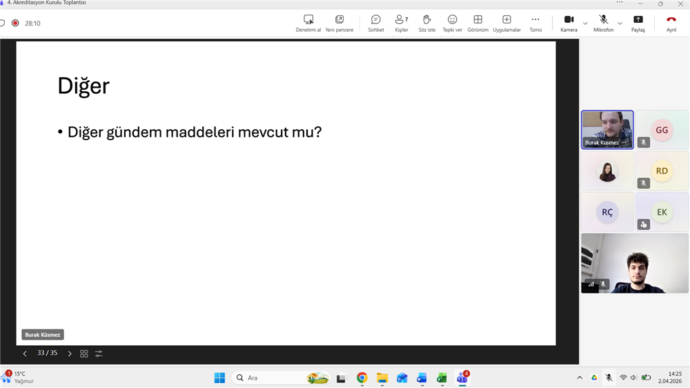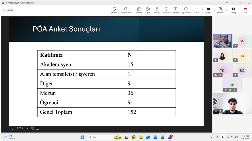 Sosyal Hizmet Bölümü Akreditasyon Kurulu, 2 Nisan 2026 tarihinde Dr. Öğr. Üyesi Burak Küsmez başkanlığında, iç ve dış paydaşların katılımıyla çevrim içi olarak toplanmıştır. PÖA anket sonuçlarının değerlendirildiği toplantıda; Program Öğretim Amaçları (PÖA), uygulama ve etik yetkinlik vurgusuyla revize edilerek nihai halini almıştır. Ayrıca, Program Öğrenme Çıktılarının FEDEK ölçütleriyle tam uyumu teyit edilmiş ve eğitim kalitesini artıracak yeni ölçme-değerlendirme yöntemlerinin hayata geçirilmesi kararlaştırılmıştır.