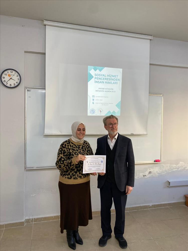 The panel discussion on Human Rights from the Perspective of Social Services concluded with the presentation of participation and appreciation certificates to Hüseyin Kerim Ece and Prof. Dr. Fethi Güngör, followed by a group photo.
