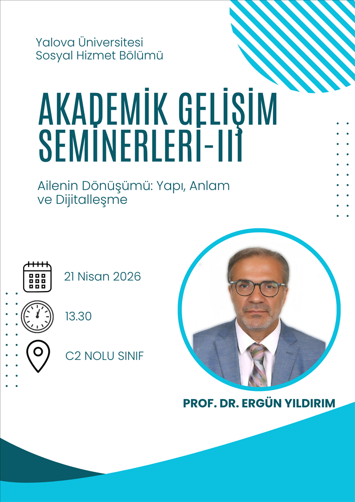 "Akademik Gelişim Seminerleri-III" kapsamında düzenlenecek olan "Ailenin Dönüşümü: Yapı, Anlam ve Dijitalleşme" başlıklı seminer, Prof. Dr. Ergün Yıldırım'ın sunumuyla 21 Nisan salı günü saat 13.30'da C2 nolu sınıfta gerçekleştirilecek.
