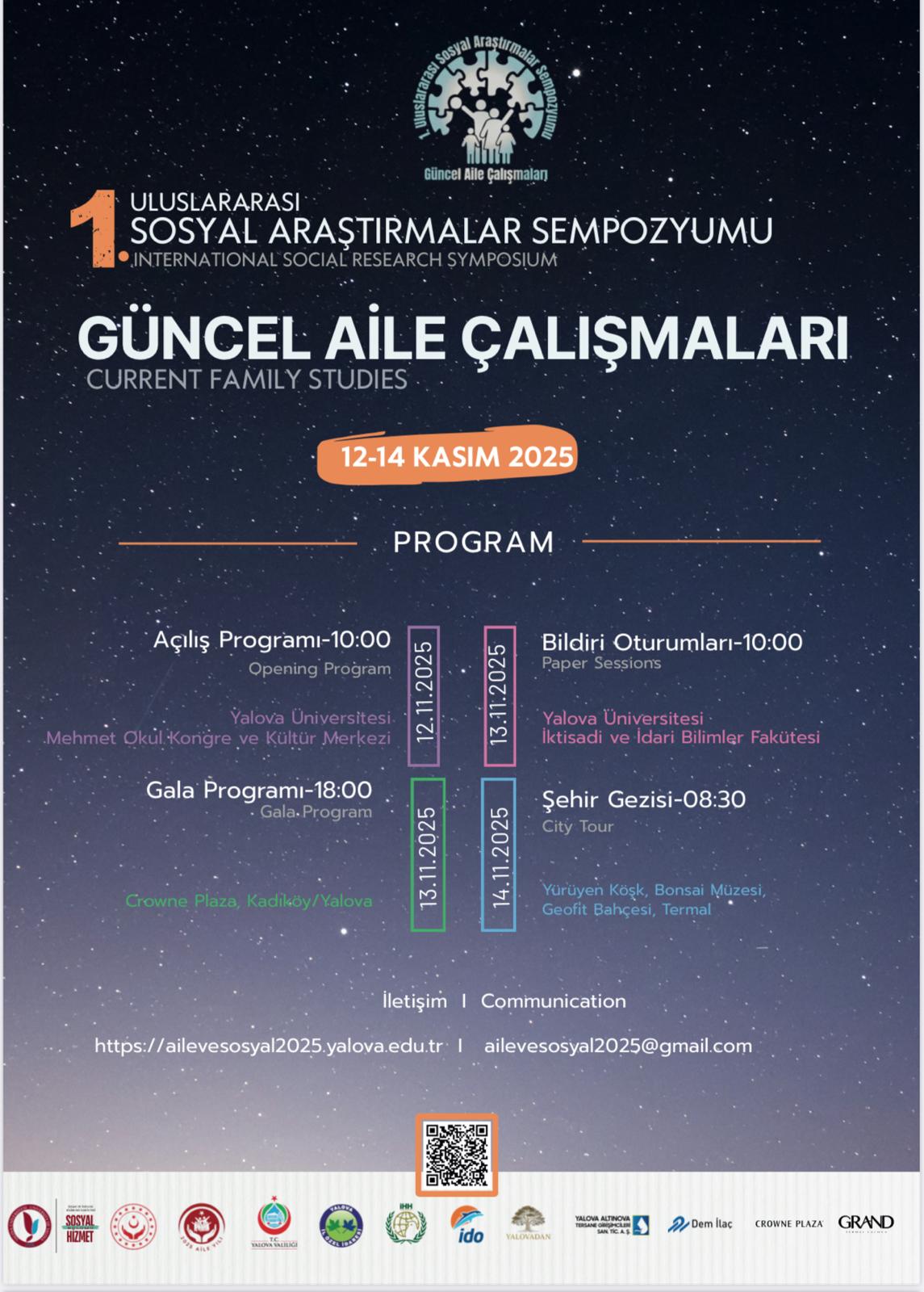 Yalova Üniversitesi İnsan ve Toplum Bilimleri Fakültesi Sosyal Hizmet Bölümü tarafından düzenlenen “1. Uluslararası Sosyal Araştırmalar Sempozyumu: Güncel Aile Çalışmaları”, 2025 Aile Yılı olarak ilan edilmesi kapsamında gerçekleştiriliyor.